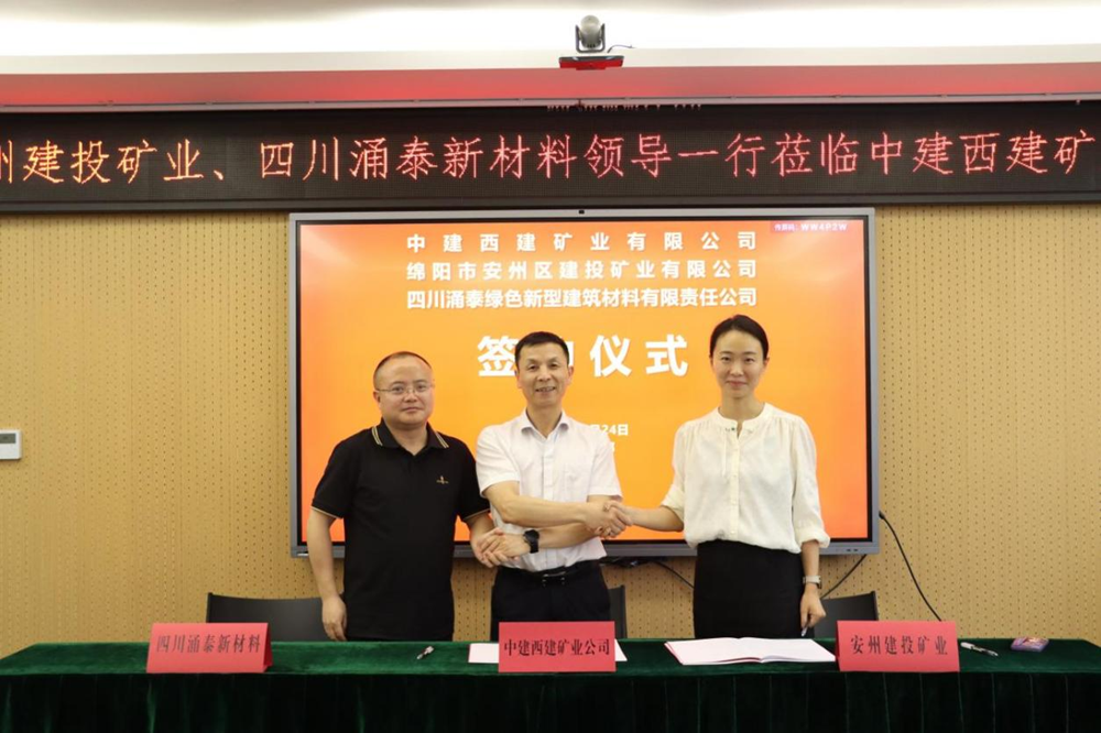 6月24日,綿陽安州礦產資源集團有限公司(以下簡稱“建投礦業”)與中建西建礦業有限公司(以下簡稱“中建西建礦業”)、四川涌泰綠色新型建筑材料有限責任公司(以下簡稱“四川涌泰新材料”)于成都正式簽署戰略合作協議。建投礦業黨支部委員、總經理楊婷婷,中建西建礦業黨總支副書記、總經理袁雪云,四川涌泰新材料董事長徐鳳瓊參加座談會及簽約儀式。
