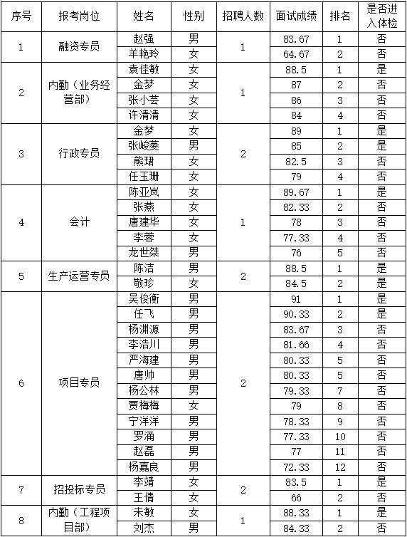 根據《綿陽安州礦產資源集團有限公司公開招聘(智聯)2022年度工作人員面試工作方案》相關規定,現將面試成績、排名及是否進入體檢公示如下: