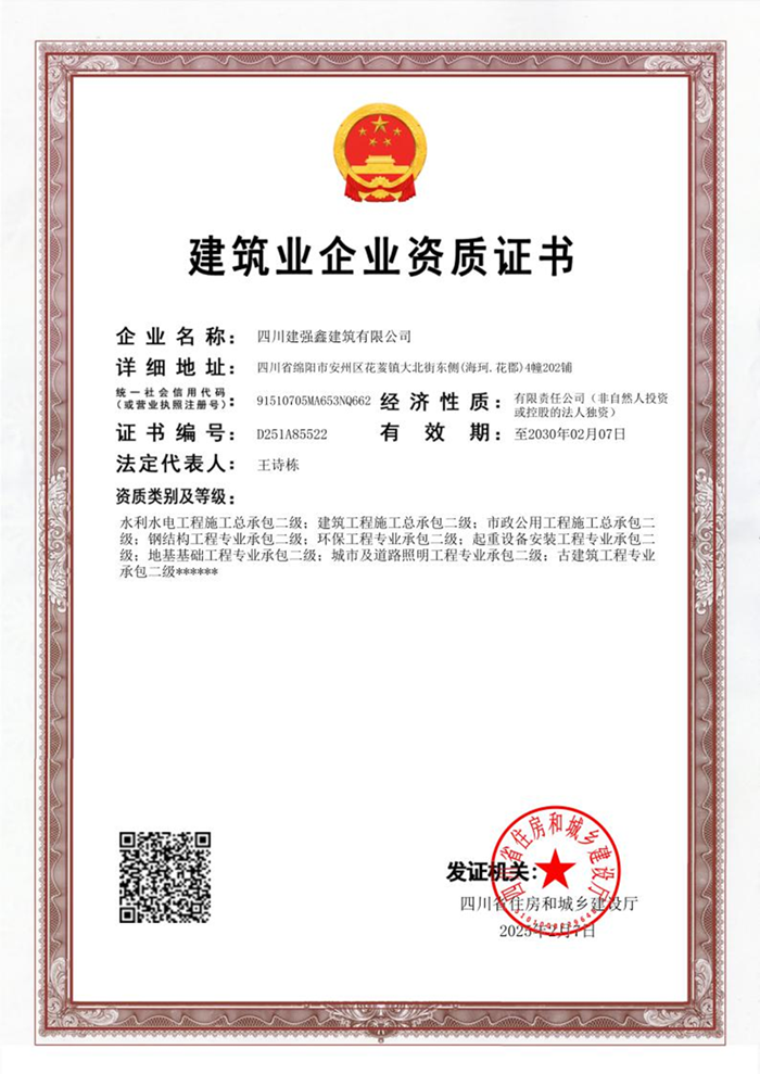 近日,經四川省住房和城鄉建設廳核準,四川建強鑫建筑有限公司(以下簡稱“建強鑫公司”)建筑、水利、市政施工總承包貳級資質,以及多項專業承包貳級資質順利通過了延續,并成功換取新證。